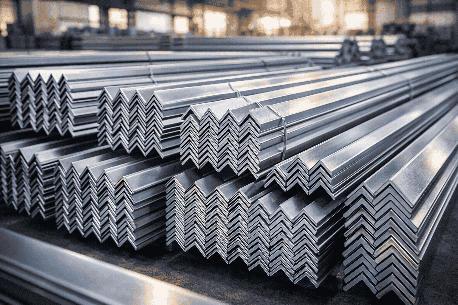 زوايا حديد جاهزة بمقاسات مختلفة تُستخدم في الهياكل المعدنية وأعمال التدعيم.